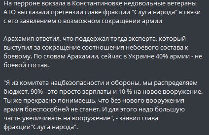 На перроне вокзала в Константиновке, куда утром приехали депутаты от "Слуги народа", недовольные ветераны АТО высказали претензии главе фракции Давиду Арахамии в связи с его заявлением о возможном сокращении армии.