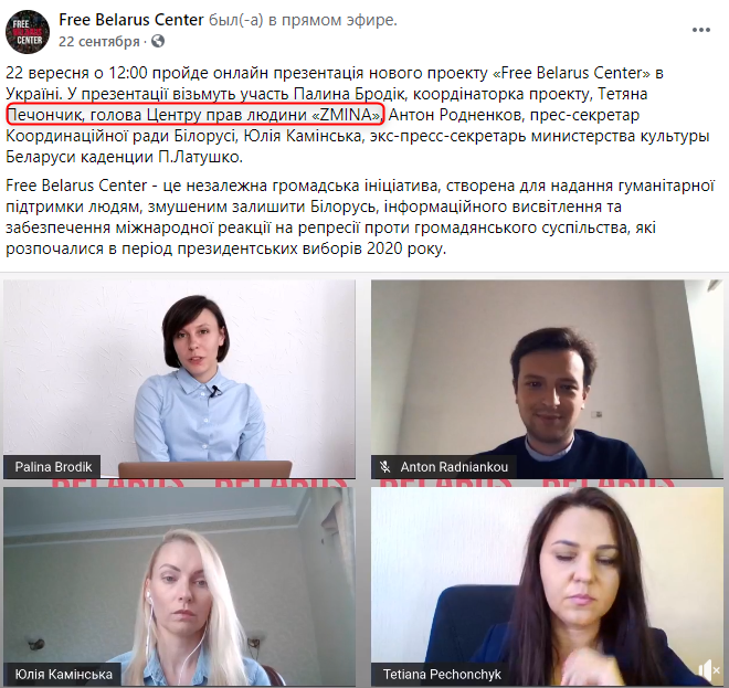 Еще два участника инициативы - выехавший из Беларуси оппозиционер Антон Родненков и живущая в Киеве советница члена белорусского Координационного совета Павла Латушко Юлия Каминская.