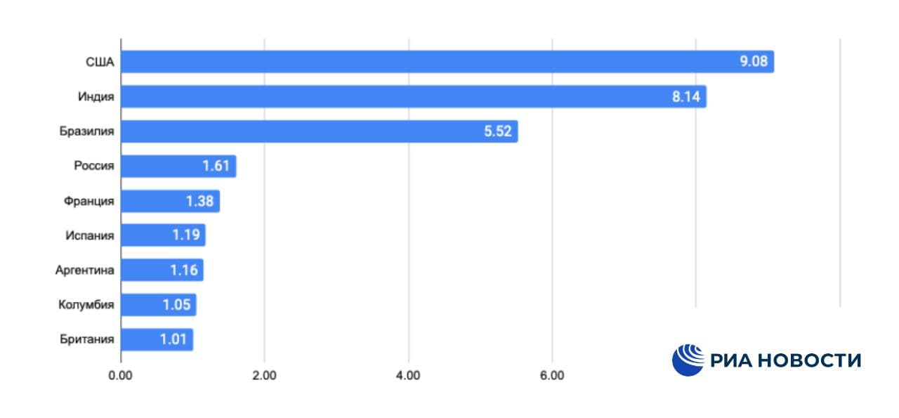 Лидирует в антирейтинге США с более 9 млн зараженных на Covid-19. Далее идут Индия (8,14 млн человек), Бразилия (5,52 млн), Россия (1,61 млн), Франция (1,38 млн), Испания (1,19 млн), Аргентина (1,16 млн), и Колумбия (1,05 млн).