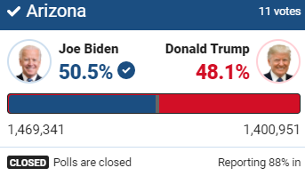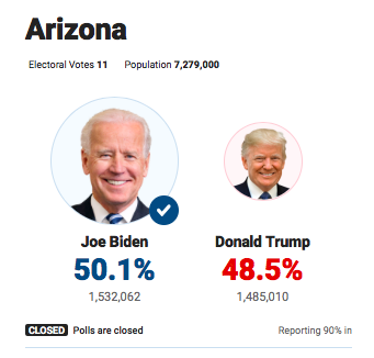 По данным Fox News, после подсчета 90% голосов демократ Джо Байден обошел Трампа в Аризоне на 0,5% (18 713) голосов.
