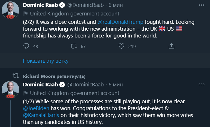 "После завершения кампании пора оставить гнев и резкую риторику позади и объединиться. Пора всей Америке объединиться. И устранить противоречия", - ответил на поздравления Байден.