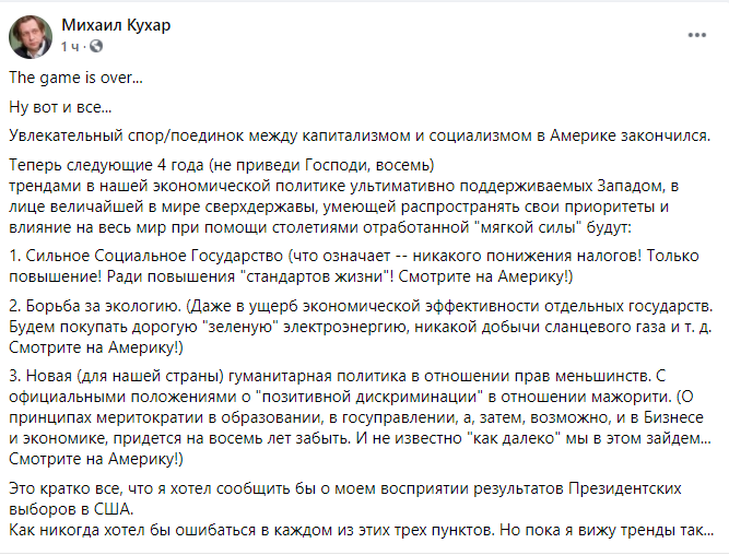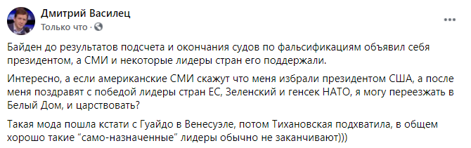 "Я так понимаю, что поминки по Жванецкому плавно переходят в празднование победы Байдена. Те кто вчера скорбил вспоминая прошедшие совместные пьянки, сегодня радуется в надежде на грядущие совместные.