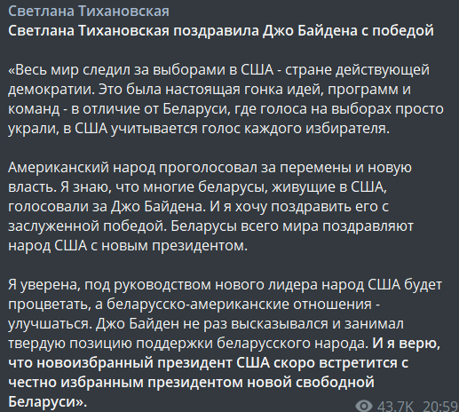 22:42  Не может быть. Байдена с победой поздравила Светлана Тихановская.