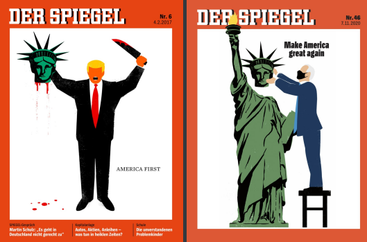 23:20  Немецкий журнал "Шпигель", который ранее изобразил Трампа, отрезавшего голову статуе Свободы, теперь показал Байдена, который возвращает ее назад.