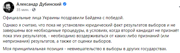 Моя принципиальная позиция - невмешательство в выборы в других государствах", - пишет нардеп Александр Дубинский.