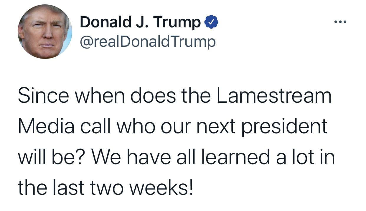 "Наблюдателей не допустили в комнаты для подсчета голосов. Я выиграл выборы, набрал 71 миллион законных голосов. Случилось много плохих вещей, которые нашим наблюдателям не позволили увидеть. Такого раньше не было. Никола не было. Миллионы почтовых бюллетеней разослали людям, которые о них никогда не просили!"