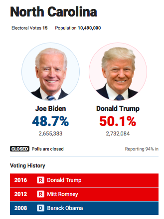 В Северной Каролине (15 выборщиков) после подсчета 94% голосов лидирует Трамп с 50,1%, у Байдена - 48,7%.