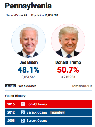 Там обработано 89% голосов. Лидирует Трамп с 50,7%, у Байдена - 48,1%.