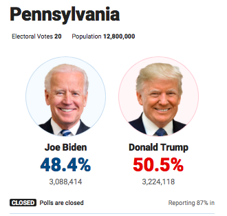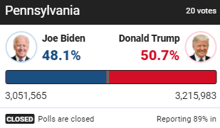 17:12 После странного подсчета в Пенсильвании, когда за день испарилось 2% подсчитанных бюллетеней, у Трампа добавилось 8 135 голосов избирателей, у Байдена - плюс 36 576 голосов.