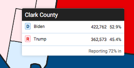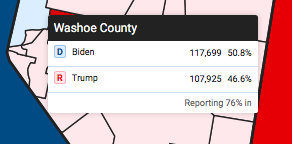 Интересно: в разрезе видно, что 15 агломераций Невады за Трампа. И только перевес в двух крупных - Уошо (на карте слева вверху) и Кларке (справа внизу) больше голосов на данный момент за Байдена.