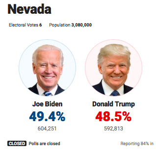 В Неваде (6 выборщиков), которая считается исконно за демократами, продолжает лидировать Байден - 49,3% против 48,7% у Трампа. Обработано 75% голосов.
