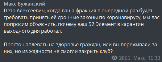 "Пётр Алексеевич, когда ваша фракция в очередной раз будет требовать принять её срочные законы по коронавирусу, мы вас попросим объяснить, почему ваш 5й Элемент в карантин выходного дня работал.