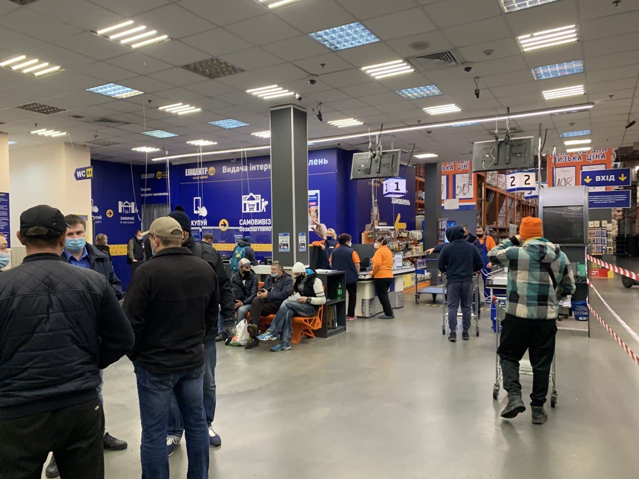 08:00  С утра в гипермаркетах "Эпицентр" столпились люди, которые пришли получать свой товар, заказанный по интернету.