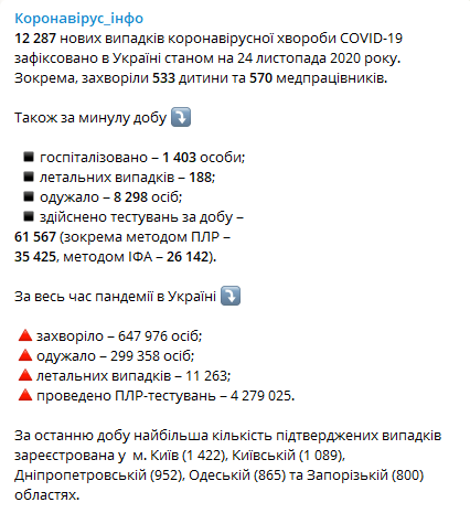 По состоянию на утро вторника 24 ноября, в Украине подтвердились 12 287 новых случаев заражения коронавирусом. Напомним, что последний антирекорд был отмечен 21 ноября, когда за сутки в стране было выявлено 14 580 зараженных.