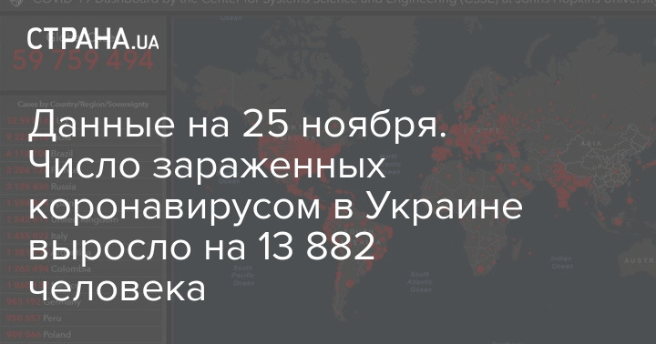 По состоянию на утро среды 25 ноября, в Украине подтвердились 13 882 новых случая заражения коронавирусом.