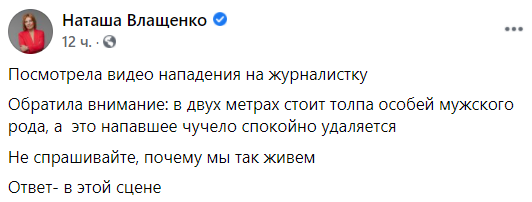 А телеведущая Наталья Влащенко обращает внимание, что никто за журналистку не заступился.