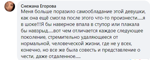"Меня больше поразило самообладание этой девушки, как она ещё смогла после этого что-то произнести... Я в шоке! Я бы наверное впала в ступор или плакала бы навзрыд... Вот чем отличается каждое следующее поколение, стремительно удаляющееся от нормальной, человеческой жизни, где не у всех, конечно, но все же была совесть и представление о чести, даже отдаленное".