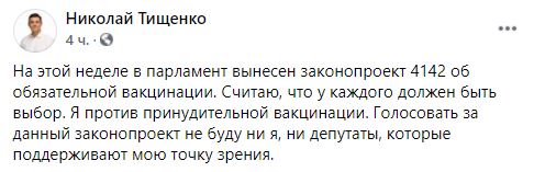 "На этой неделе в парламент вынесен законопроект 4142 об обязательной вакцинации. Считаю, что у каждого должен быть выбор. Я против принудительной вакцинации. Голосовать за данный законопроект не буду ни я, ни депутаты, которые поддерживают мою точку зрения", - написал Тищенко в Фейсбуке.