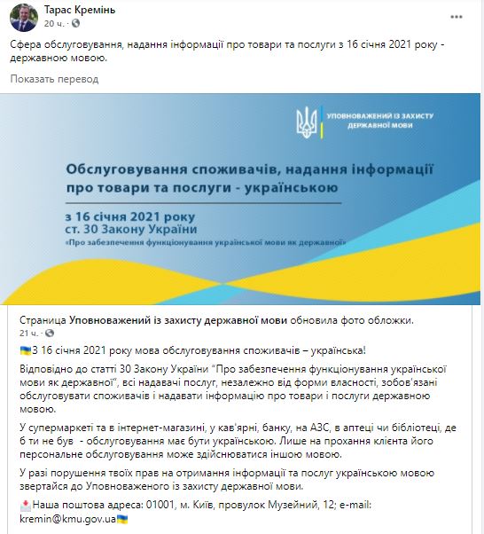 Тарас Креминь у себя в "Фейсбуке" написал, что с 16 января 2021 года сфера обслуживания переходит на украинский язык – в соответствии со статьей 30 закона "Об обеспечении функционирования украинского языка как государственного".