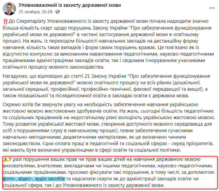 Новый омбудсмен достаточно быстро развил бурную деятельность. Он встречается с чиновниками, коллегами из стран, где есть подобные должности, а также активно ведет соцсети. Несколько эпизодов заслуживают внимания. Они показывают, что с наступлением эры штрафов украинизация станет очень жесткой.