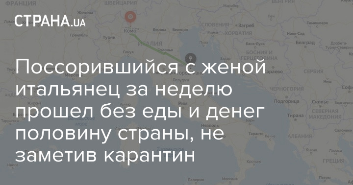 Житель итальянского города Комо прошел полстраны пешком, прогуливаясь после ссоры с женой, чтобы успокоиться. Его нашли в 450 километрах от родного дома.
