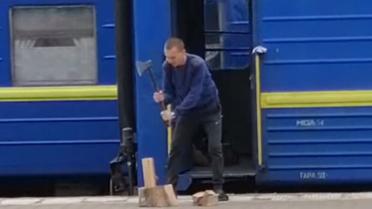 Вокруг "Укрзализници" разгоняется новый скандал. В сети появилось видео, на котором проводник прямо на перроне Одесского вокзала рубит дрова, очевидно, чтобы протопить в вагоне.