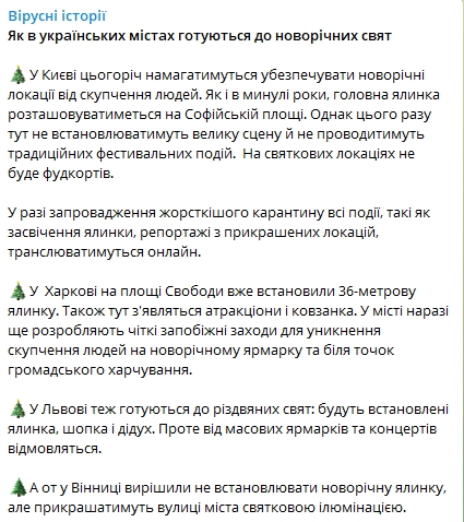 В частности, в столице откажутся от фудкортов, в Харькове разрабатывают ограничительные меры, чтобы избежать массового скопления людей на ярмарке в центре города. Во Львове не будет праздничных концертов, а в Виннице решили не устанавливать новогоднюю елку.