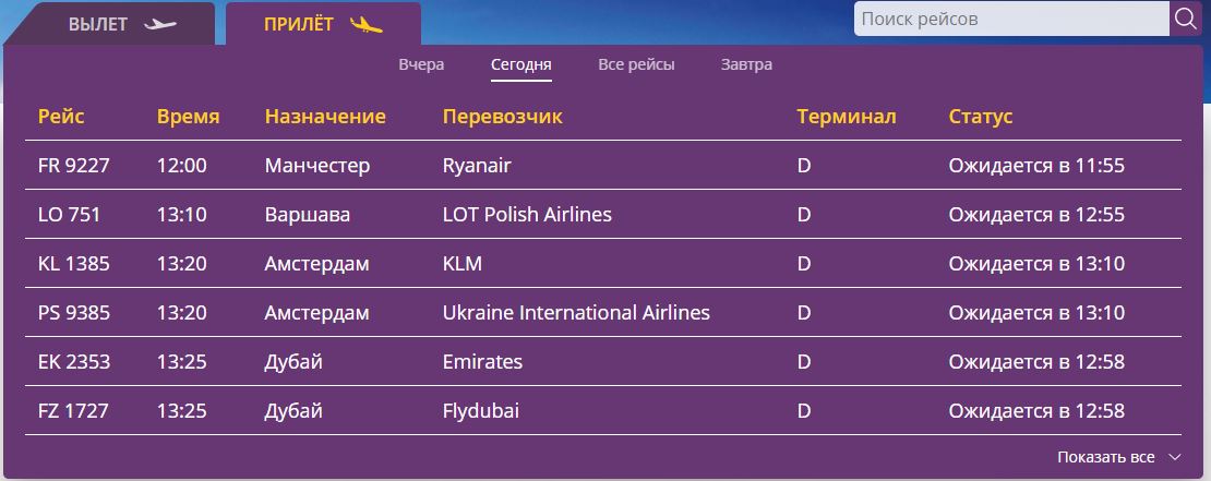 Скриншот прилетов онлайн-табло аэропорта "Борисполь" 21 декабря 2020 года