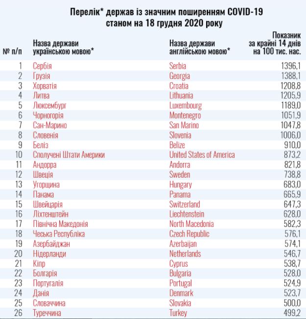 Список стран со значительным уровнем распространения Covid-19 обновляется каждые 7 дней. В "красный список" Украина включает страны, где количество новых случаев на 100 тысяч населения за последние 14 дней превышает аналогичный показатель в Украине.