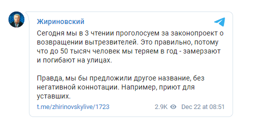 Перед голосованием в Думе о законопроекте в соцсети написал лидер фракции ЛДПР Владимир Жириновский. Он предложил осовременить название вытрезвителей и переименовать их в "приюты для уставших".