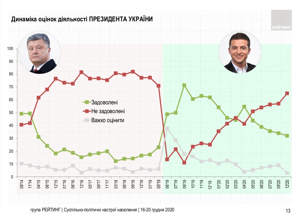 Антирейтинг Порошенко держался на уровне 80%, начиная где-то с 2015 года. На этом контрасте Зеленский получил в начале своей каденции почти 70% позитивных ожиданий.