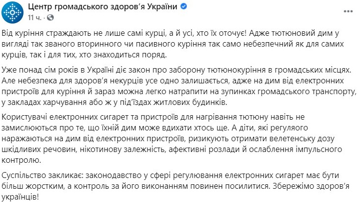 Врачи напомнили, что уже более семи лет в Украине действует закон о запрете курения в общественных местах, но опасность для здоровья некурящих все равно остается, ведь дым от электронных устройств для курения и сейчас можно легко встретить на остановках общественного транспорта, в учреждениях питания или в подъездах жилых домов.