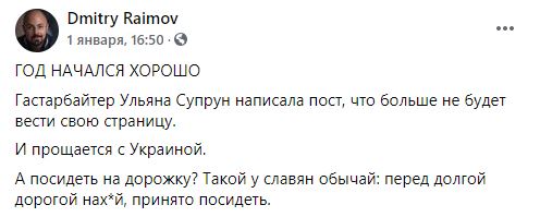 "Год начался хорошо. Гастарбайтер Ульяна Супрун написала пост, что больше не будет вести свою страницу. И прощается с Украиной. А посидеть на дорожку? Такой у славян обычай: перед долгой дорогой на@й, принято посидеть", - написал политтехнолог Дмитрий Раимов.