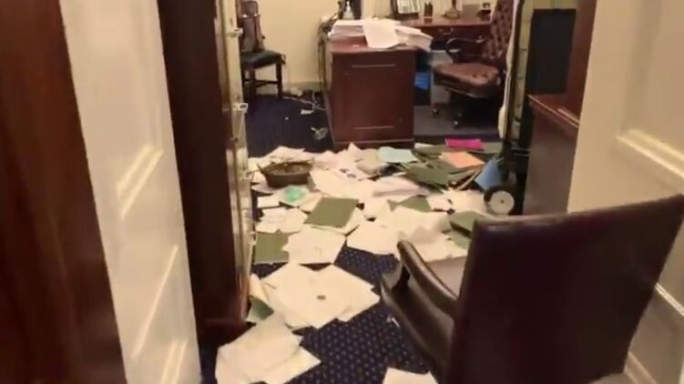 Так, на видео показано, как на полу кабинета разбросаны документы и мусор. Также на рабочем месте советника Сената сдвинуты кресла. О каких-либо существенных разрушениях там не сообщается.
