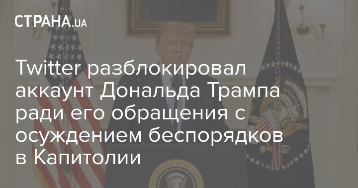 Администрация социальной сети Twitter разблокировала аккаунт Дональда Трампа для публикации его видеообращения, в котором он публично признал поражение и осудил беспорядки в Капитолии.