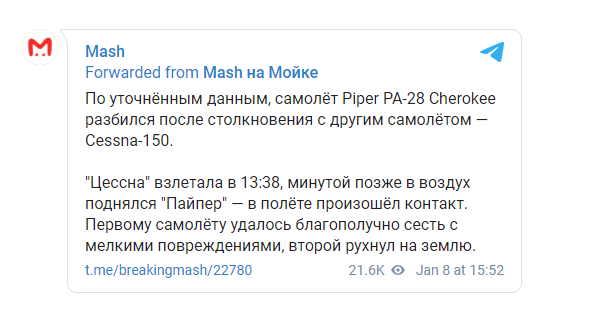 По уточненным данным, самолет Piper PA-28 Cherokee разбился после столкновения с другим самолетом - Cessna-150.