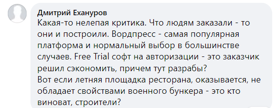 "Какая-то нелепая критика. Что людям заказали – то они и построили. WordPress – самая популярная платформа и нормальный выбор в большинстве случаев. Free Trial софт на авторизации – это заказчик решил сэкономить, причем тут разрабы? Вот если летняя площадка ресторана, оказывается, не обладает свойствами военного бункера – это кто виноват, строители?" – написал в комментарии Дмитрий Ехануров.