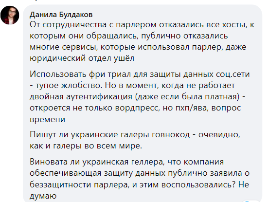 "...Виновата ли украинская геллера, что компания обеспечивающая защиту данных публично заявила о беззащитности парлера, и этим воспользовались? Не думаю", - прокомментировал также Данила Булдаков.