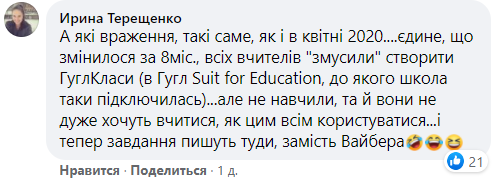 "3 класс. Все задания в Google-класс, вайбер. Классная и домашняя. Вынуждены были сами все читать, смотреть видео, я была за всех учителей. Второй ребенок 4 лет тынялся 4-5 часов пока мы "делали уроки". Дурдом, а не обучение, никому не пожелаю", – написала Ирина Марухно.