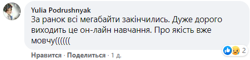 Онлайн-обучение больно бьет по карману тех родителей, кто не имеет обычного интернета и использует мобильный: "За утро все мегабайты закончились. Очень дорого выходит это онлайн-обучение. Про качество – уже молчу", – пишет Юлия Подружняк.