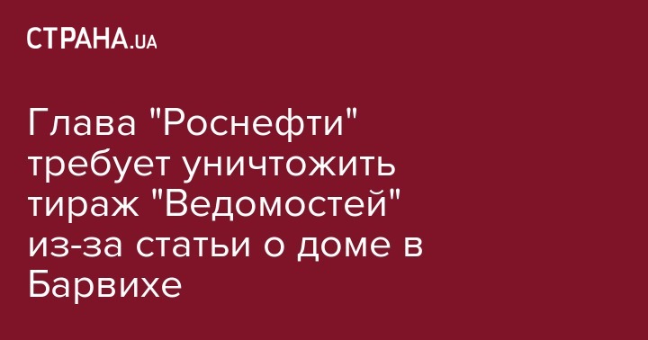 Глава "Роснефти" Игорь Сечин подал в суд иск на газету "Ведомости" и потребовал уничтожить весь тираж номера, в котором была опубликована статья о его особняке в Барвихе. Об этом сообщает руководитель юридического отдела издания Владимир Румянцев, передает Meduza.io.