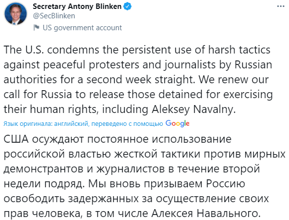 13:17 Госсекретарь США Энтони Блинкен призвал Россию освободить Навального. И перестать применять "жесткую тактику" к его сторонникам.