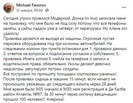 Тем временем Михаил Фаворов в США привился вакциной американской компании Moderna. Об этом он написал в Facebook 12 января.