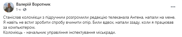 В свою очередь сам пострадавший журналист на своей странице в соцсети сообщил подробности нападения.  По его словам в редакцию ворвался начальник управления инспекции Черкасского горсовета Станислав Коломиец и его подручный.