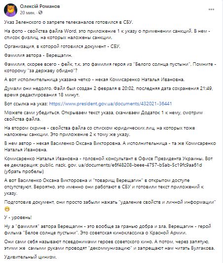 Окружение и заокеанские хозяева Зеленского его руками зачищают информационное поле от оппонентов, сделали из него инструмент властного беспредела, убеждая Президента в его исключительности и праве принимать противозаконные решения. Но за такие решения неизбежно придется нести ответственность. На ум приходит пророчество из запрещенной властью Зеленского книги "Мастер и Маргарита" Михаила Булгакова: "…Аннушка уже купила подсолнечное масло, и не только купила, но даже и разлила"".