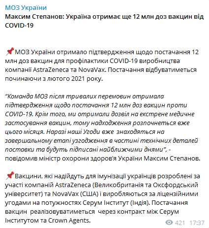 В частности, об этом Министр здравоохранения Максим Степанов сообщил президенту Владимиру Зеленскому в ходе сегодняшнего совещания. По словам Степанова, сегодня Украина получила подтверждение на поставку 12 млн доз вакцин производства компании AstraZeneca и Novavax. Поставки будут проходить с февраля 2021 года.