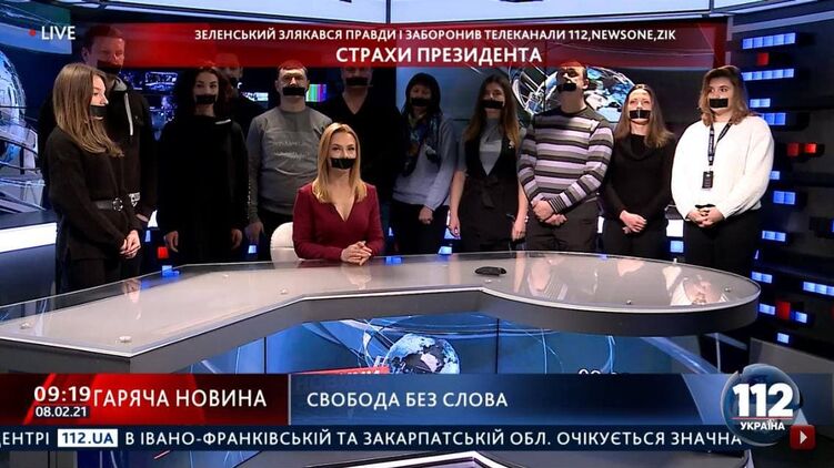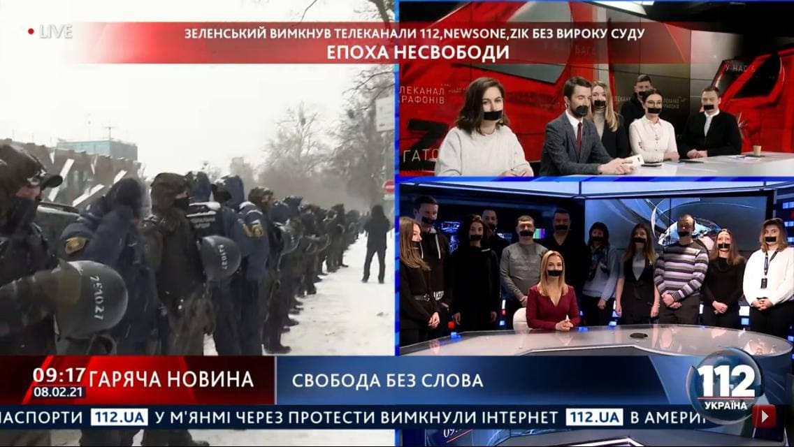 Утром в понедельник, 8 февраля, журналисты трех закрытых оппозиционных каналов ZIk, 112 и NewsOne вышли в эфир с заклеенными ртами в знак протеста против ограничения на свободу слова.