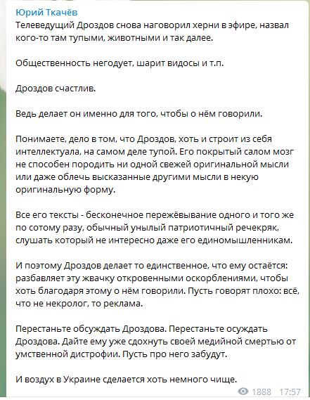 "Телеведущий Дроздов снова наговорил херни в эфире, назвал кого-то там тупыми, животными и так далее. Общественность негодует, шарит видосы и т. п. Дроздов счастлив. Ведь делает он именно для того, чтобы о нем говорили.