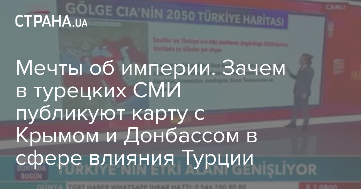 Близкий к местному президенту Эрдогану телеканал TGRT продемонстрировал в эфире карту с Крымом, да еще и с восточной Украиной, включая весь Донбасс, в составе Турции. Якобы украинские земли и другие территории территории за следующие 30 лет могут оказаться под влиянием Турции - со ссылкой на прогнозы американской частной разведывательной компании Stratfor. Причем этим прогнозам, к слову, исполнилось уже 12 лет.