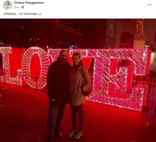 На ней супруги стоят на фоне светящейся надписи Love. "Любовь - это талисман", - прокомментировала фотографию Кондратюк.
